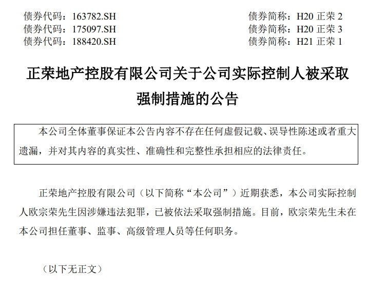 正荣地产债券公告显示,公司近期获悉,公司实际控制人欧宗荣因涉嫌违法犯罪,已被依法采取强制措施。目前,欧宗荣未在本公司担任董事、监事、高级管理人员等任何职务。